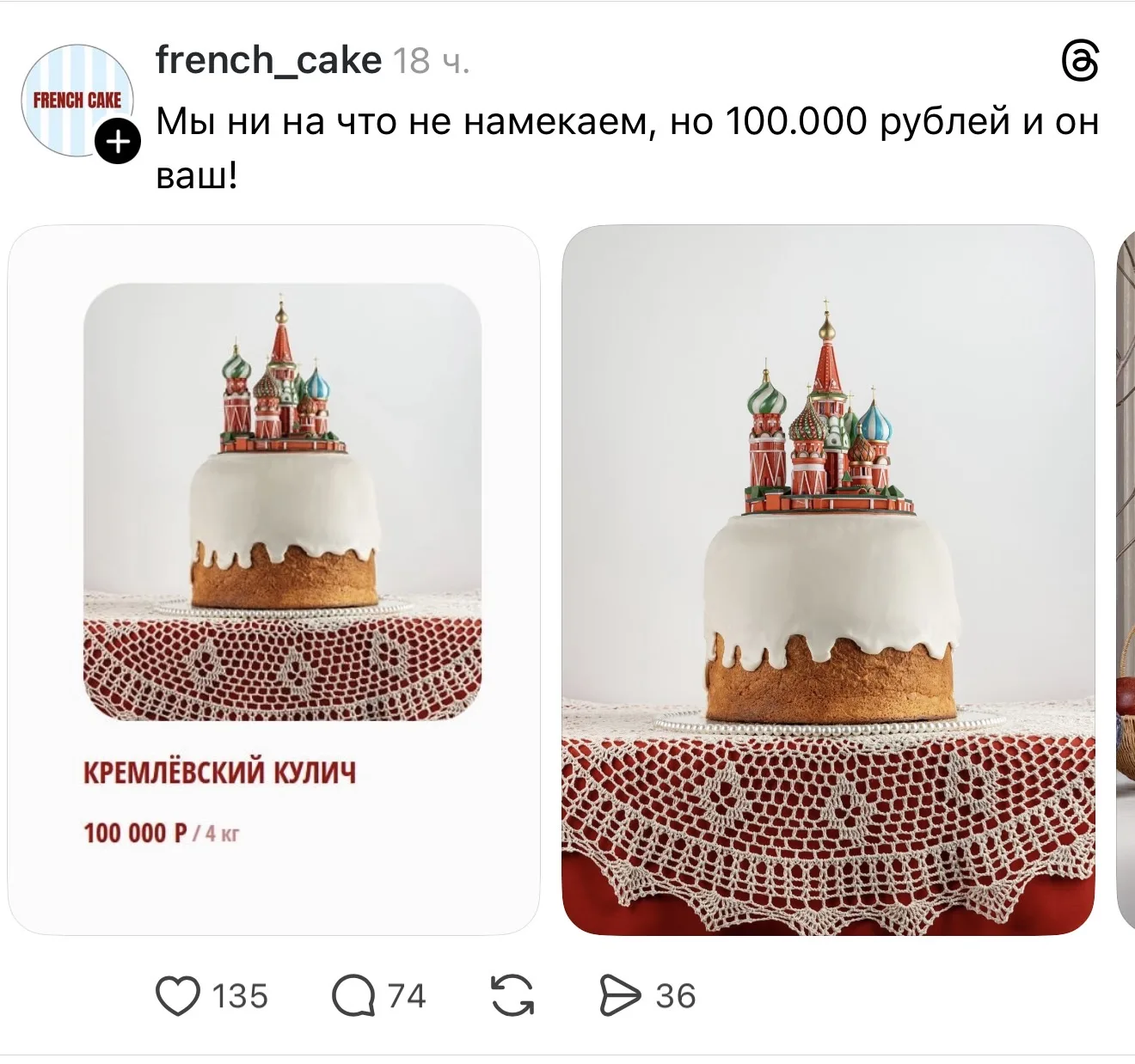 В Москве все стабильно. Кулич за 100к, завтрак с икрой за 100к. Скоро все будет по 100к