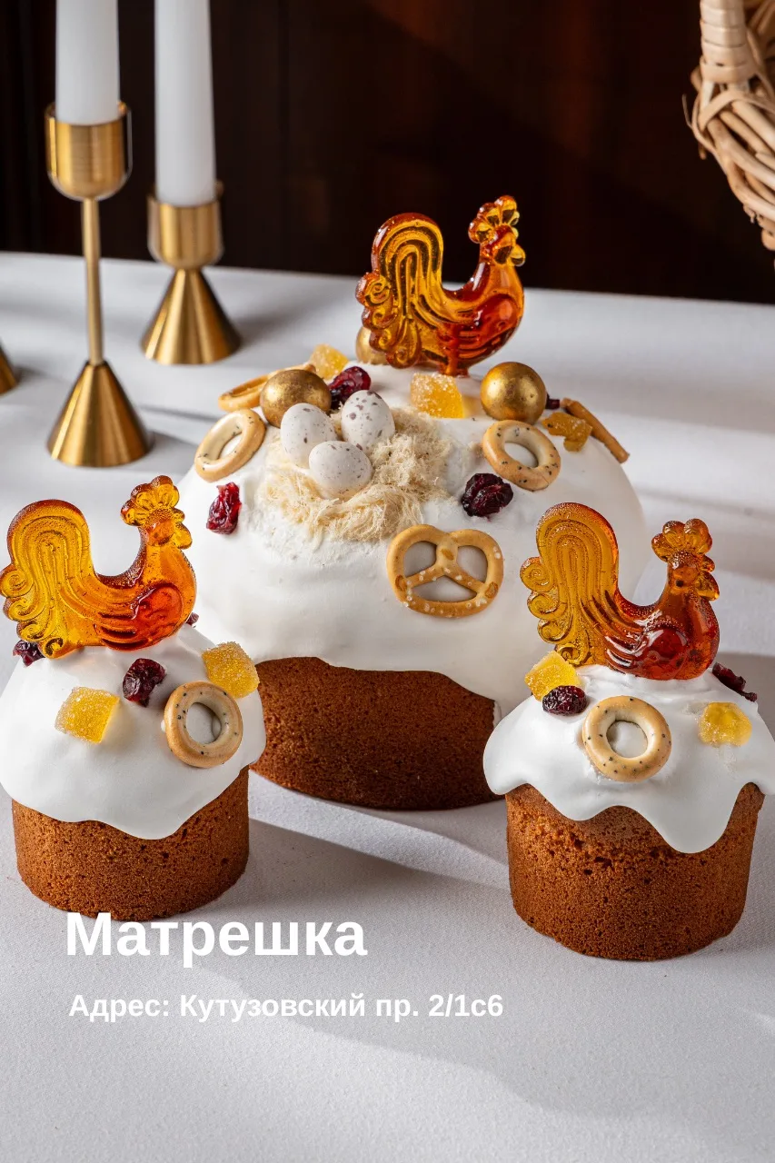 ▪️Матрешка — кулич (7500₽). Цукаты апельсина и тыквы, изюм, клюква, фундук, шоколад, заварной крем и ягодный соус, покрыт глазурью, украшен баранками, цукатами, клюквой, шоколадными яйцами и сахарным петушком.