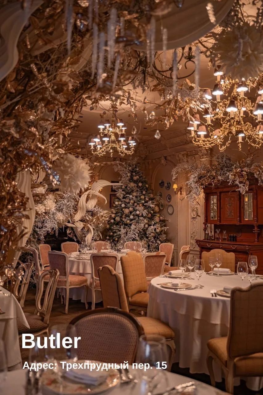 ▪️Butler — выступления Artsvik, Ирины Салтыковой, Татьяны Овсиенко и Ирины Дубцовой, караоке и танцы, праздничный ужин от бренд-шефа Джузеппе Дави, во дворе карусель с лошадьми, пятиметровая ель и огоньки гирлянд, в залах декор в бело-золотых тонах.