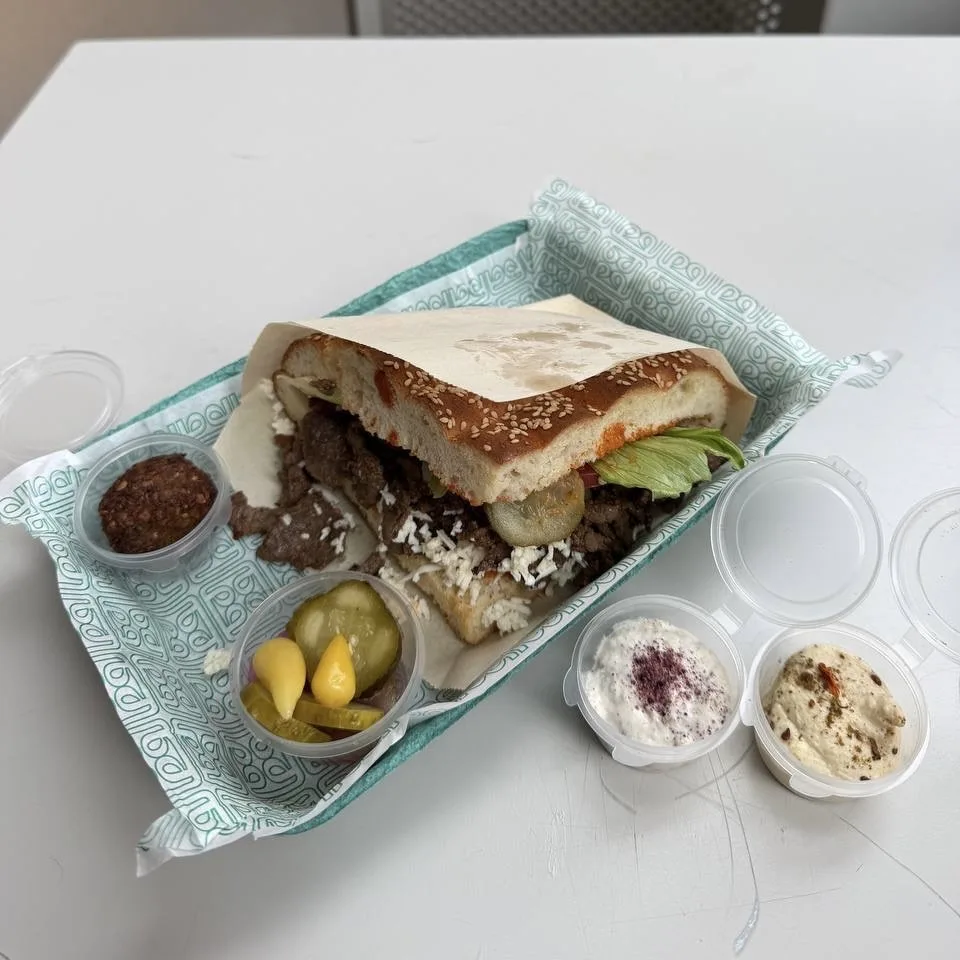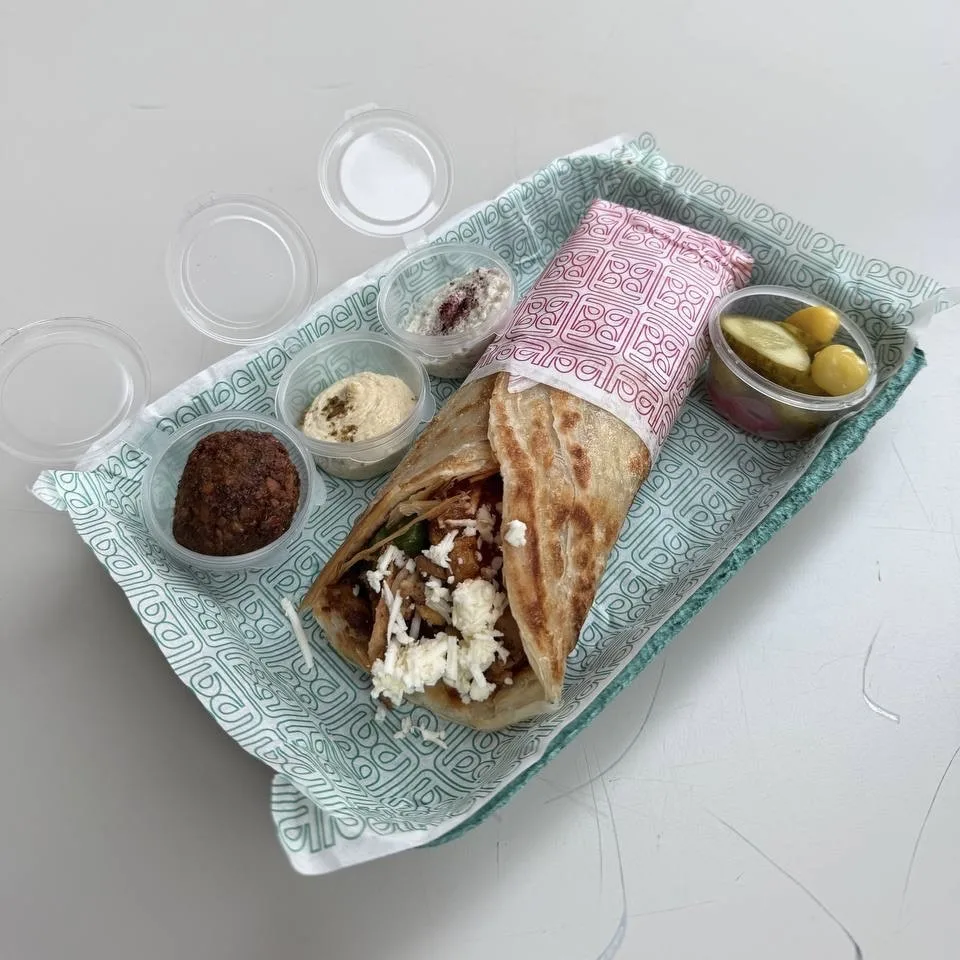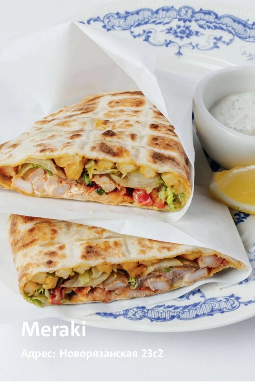 ▪️Meraki — гирос с кебабом из баранины (1650₽). Томаты, маринованные огурцы, красный лук, подают с картофелем фри и соусами: харисса со специями, шрирача, восточный и шашлычный.