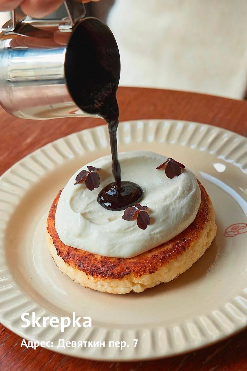 ▪️Skrepka — гранд-сырник (590₽). Сырник на рисовой муке обжаривают на масле нуазетт, подают с кремом из маскарпоне, соцветиями кислицы и черничным вареньем.
