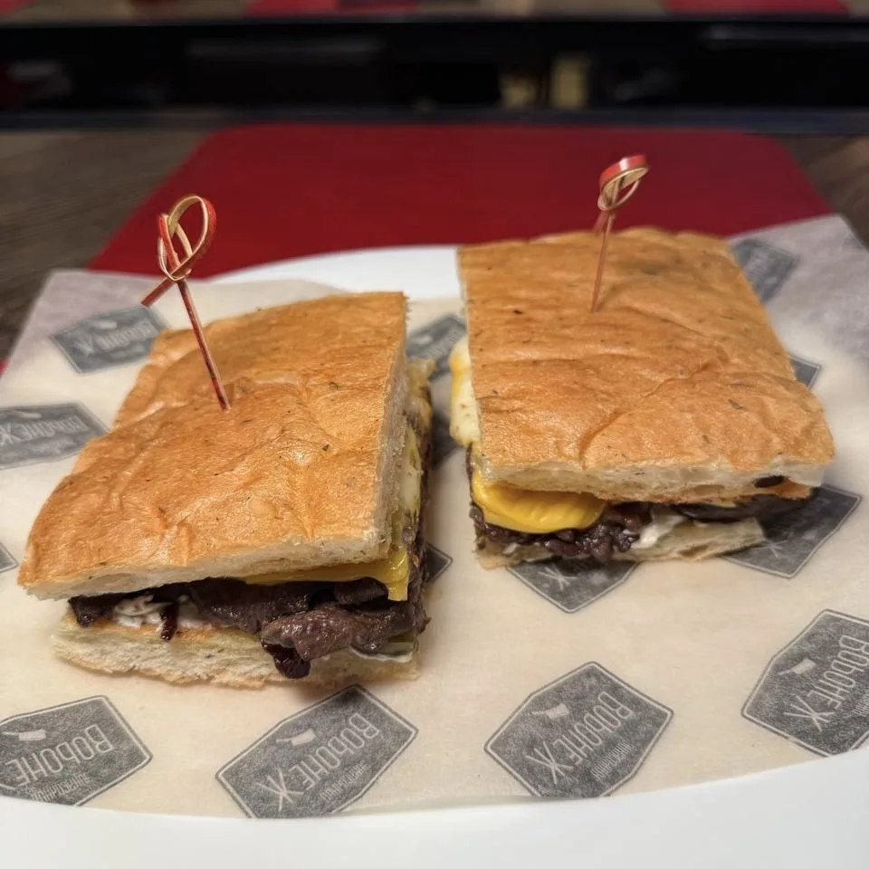 ▪️Филадельфия чиз-стейк (1200₽) — слайсы мраморной вырезки, маринованные в фирменом соусе с карамелизированным луком, чеддер, красный лук, сливочный сыр, халапеньо, чиабатта. Очень сытный, можете брать на двоих.