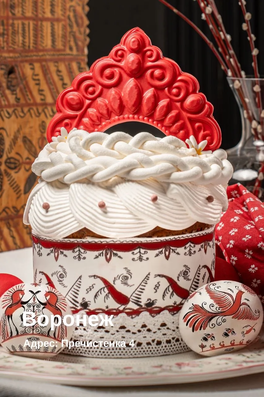 ▪️Воронеж — кулич с кокошником (5700₽). Цедра апельсина, цукаты из вишни и клюквы, вымоченные в апельсиновом соке с коньяком. В состав входят 10 яиц с росписью.