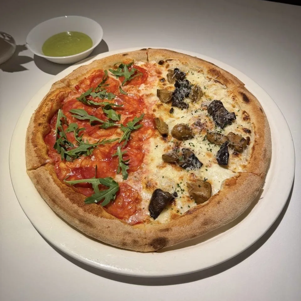 ▪️Пицца (1220₽) — можно взять любую пиццу по половине, собственно говоря, что я и сделал: пепперони и лесные грибы, пепперони почти без остроты, идеальная томатная паста, лесные грибы с пекорино, без восторгов, но вкусно. Пицца огромная, порядка 40см, берите на двоих. Кстати, тут могут приготовить пиццу без глютена, вместо теста используют миндальную муку и капусту.