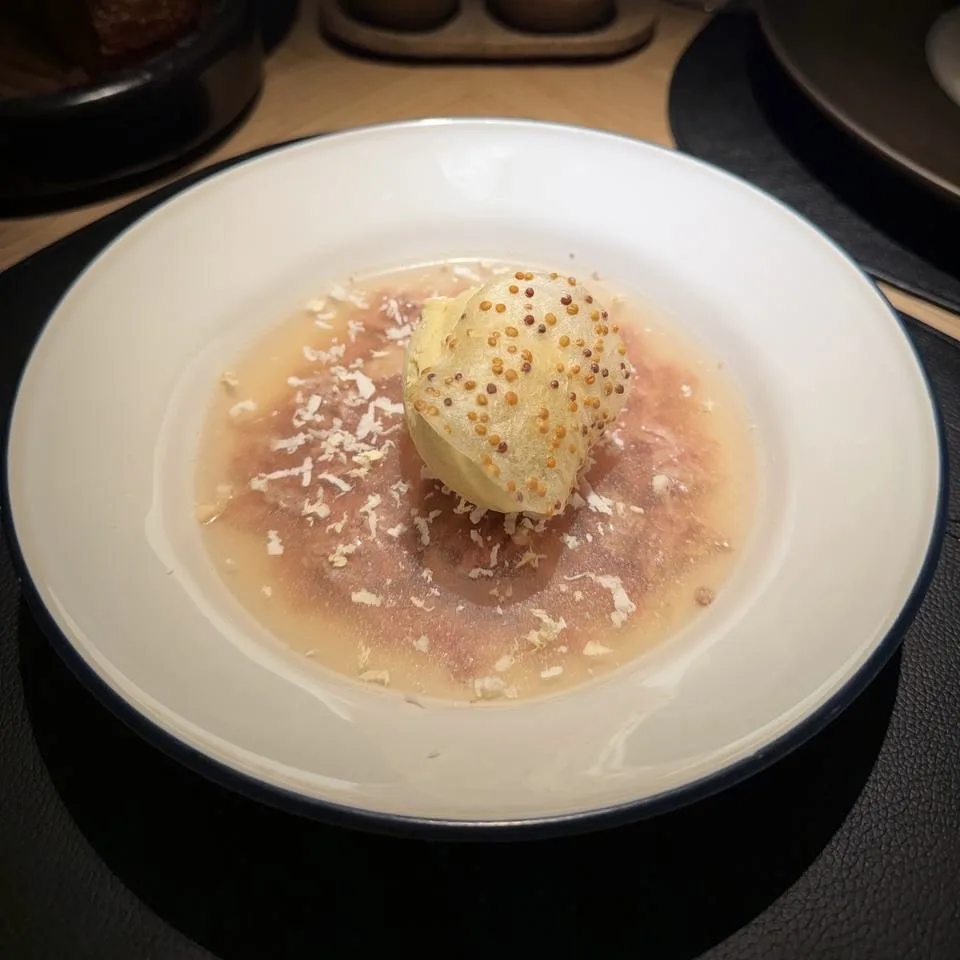 ▪️Холодец (640₽) — телятина, с тертым хреном, горчичным мороженым и чипсом из дижонской горчицы. Восхитительный холодец! В сочетании с мороженым из горчицы, просто шедевр!
