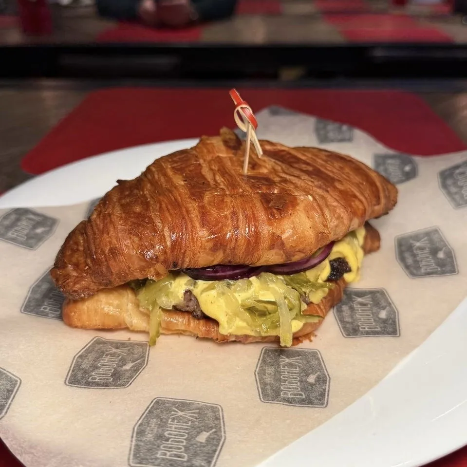 ▪️Смеш круассан (860₽) — плоская говяжья котлета, 2 спрессованных круассана, маринованные огурцы, красный лук, чеддер и соус барбекю. Круассаны плотные, не сухие, мясо идеальное.