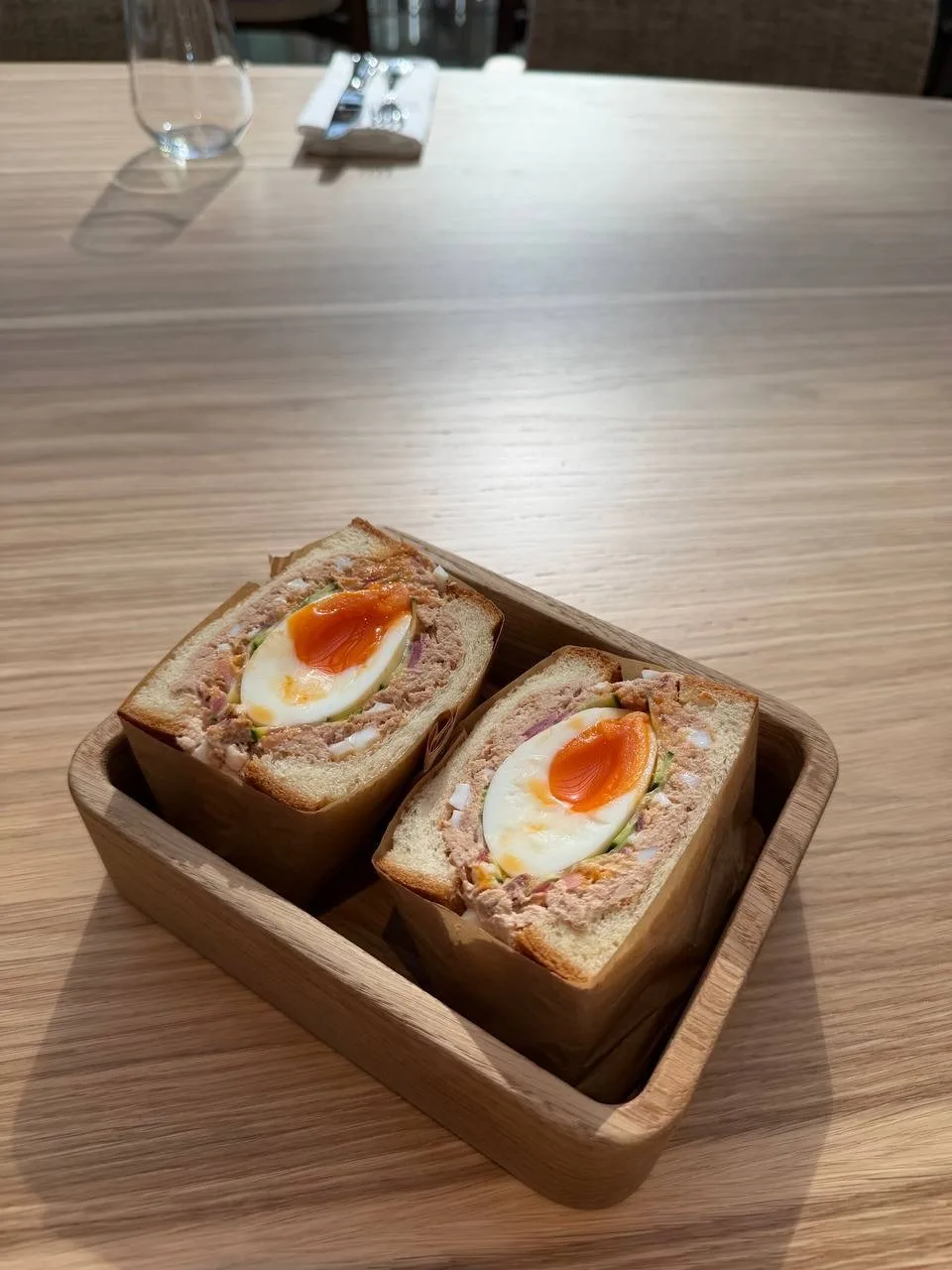 ▪️Сэндвич с тунцом (690₽) — консервированный тунец, замешанный с яйцом, красный лук, свежие огурцы, вареное яйцо, бриошь. Шикарный!