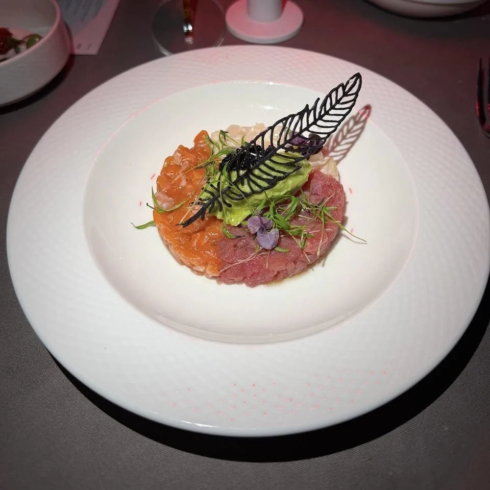 За кухню отвечает Pinskiy & Co. При входе — welcome drink (игристое, вино или лимонад). На столе уже стоят закуски, потом подают основную закуску, горячее и десерт. Меню можно выбрать: мясное или рыбное. Пробовали оба — всё отлично, кроме горячего в мясном, мясо суховато. Алкоголь отдельно, бокал просекко — 850₽, сейчас это вполне ок.