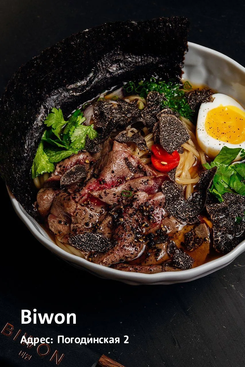 ▪️Biwon — рамен с говядиной и трюфелем (2300₽). Бульон на говяжьих костях с имбирём, чесноком и зеленью, заправка таре, пшеничная лапша, говядина, маринованное яйцо, зелень, грибы и трюфельное масло.