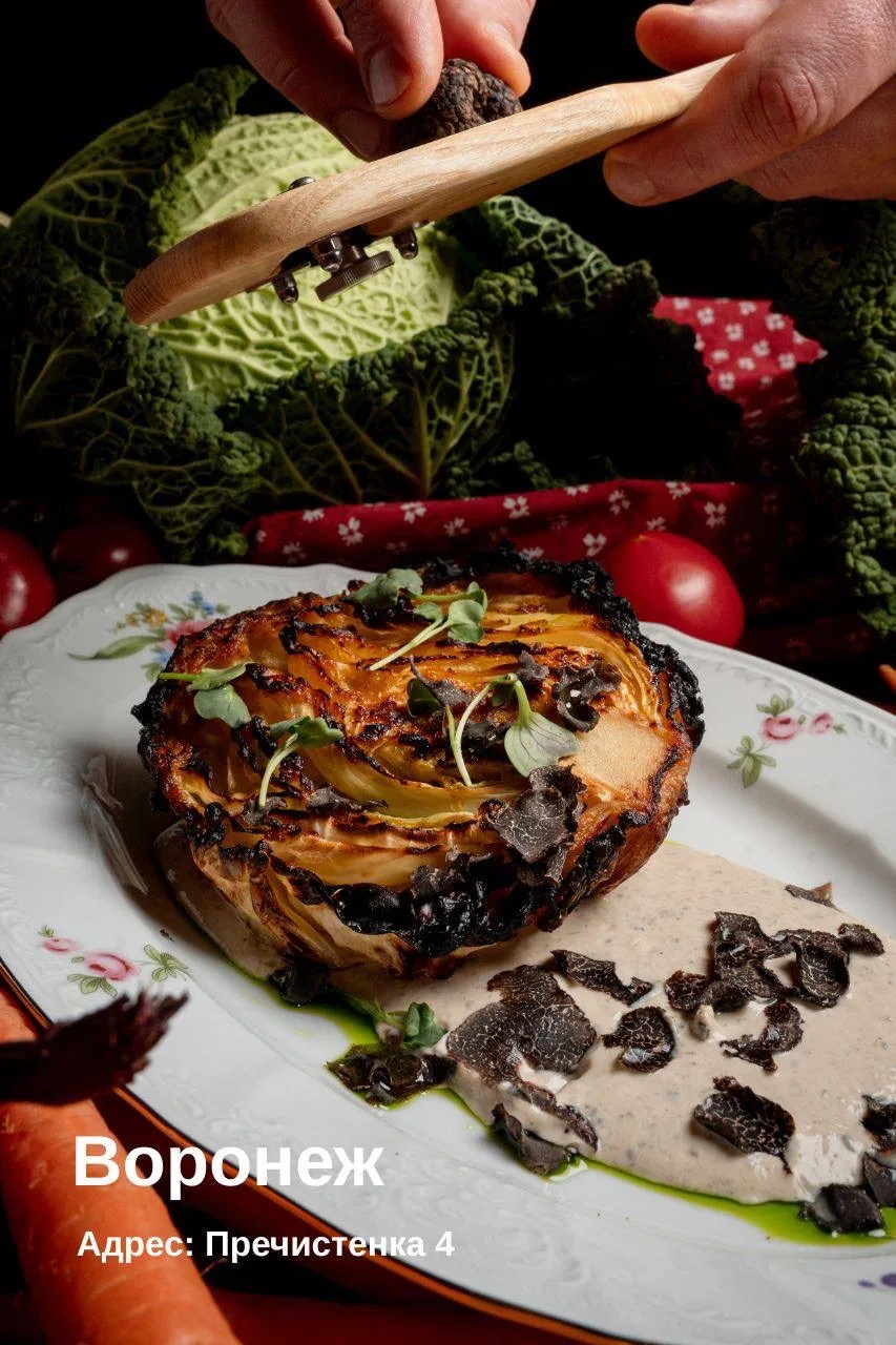 ▪️Воронеж — винегрет с белыми грибами и подкопченной вишней (750₽), паста казаречче с грибами и шпинатом (1200₽), стейк из капусты с трюфельным соусом (650₽).