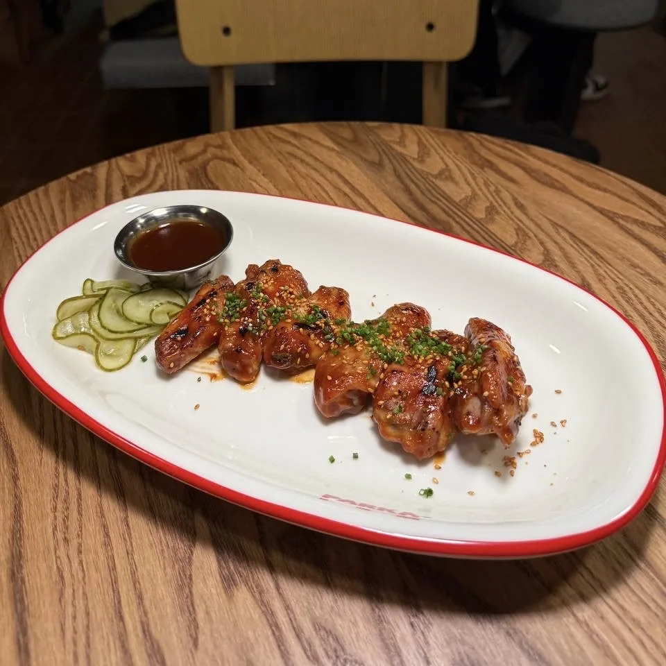 ▪️Куриные крылья (690₽) — крылышки в соусе барбекю, кунжутом, луком сибулет, подают с маринованными огурчиками и соусом виски-кола (на выбор). Крылья слегка острые, с дымком, а соус — это нечто! Похож на сладкий чили, но с оттенком колы.