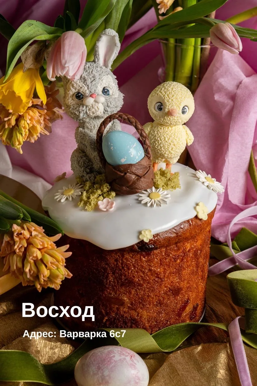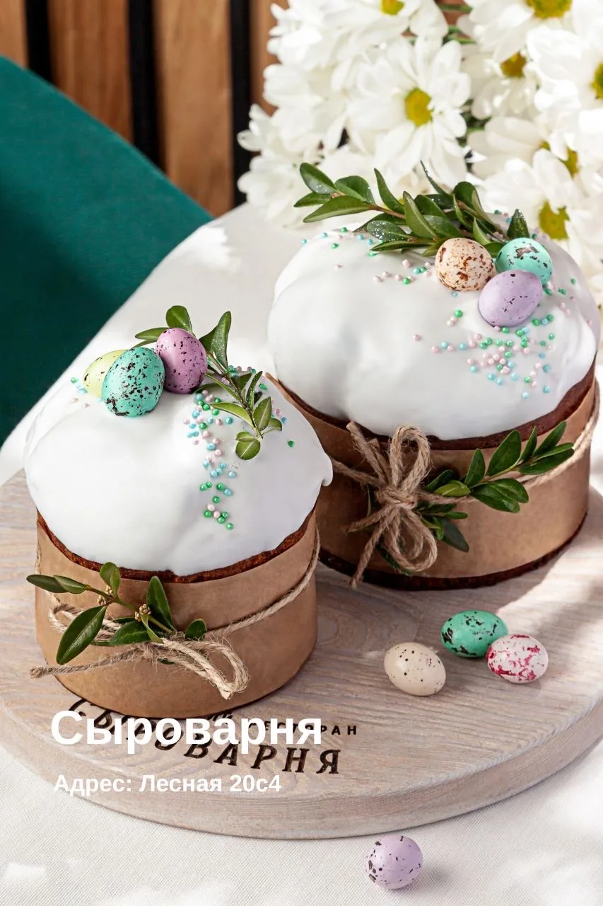 ▪️Сыроварня — сдобный кулич с изюмом (1450₽). Сахарная глазурь, веточки эвкалипта и пасхальные яйца из шоколада.