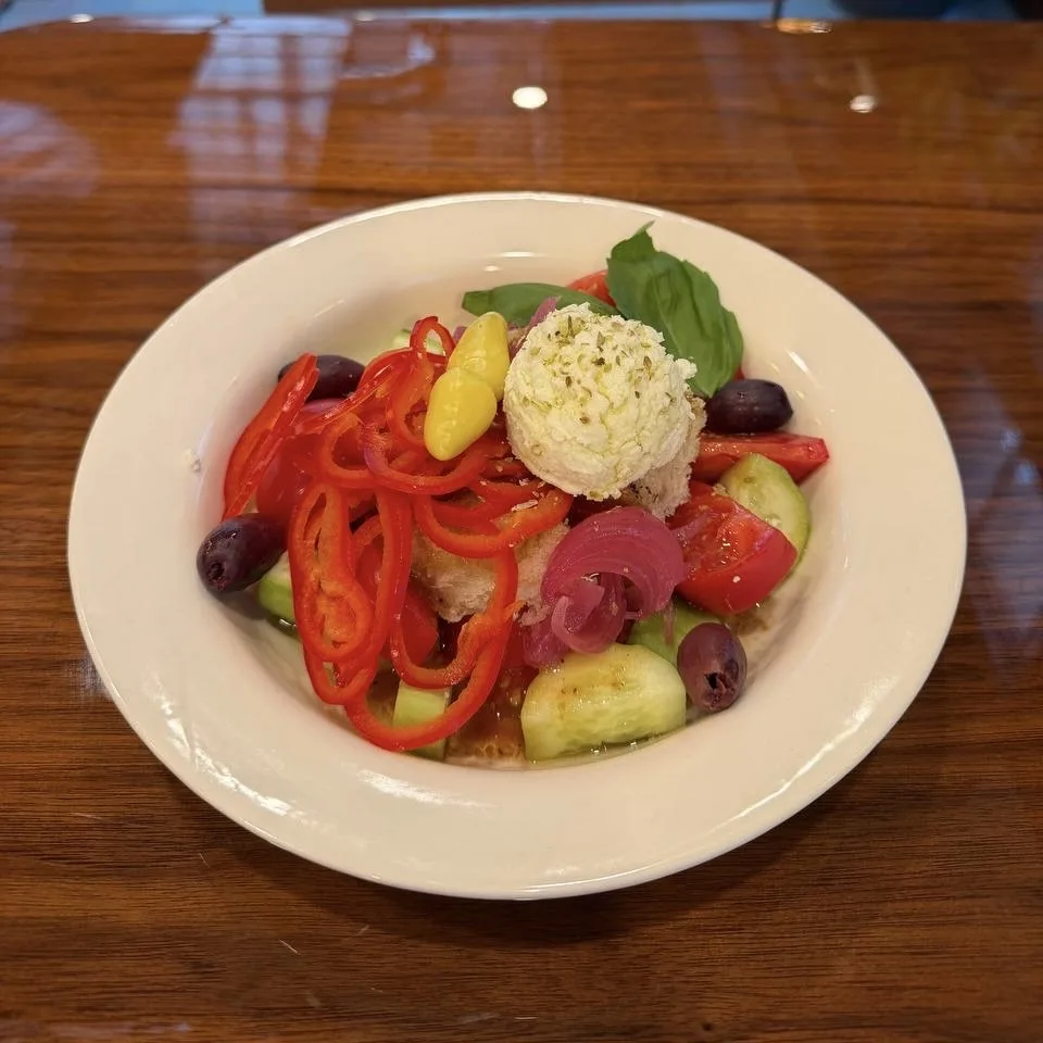 ▪️Греческий салат (890₽) — фермерская фета, томаты, огурцы, маринованный лук и перцы, рамиро, оливки, базилик, заправка на основе оливкового масла, горчицы и сахара. Я бы сильнее обжарил хлеб, а то он слишком быстро мякнет. В остальном — очень качественный и вкусный салат.