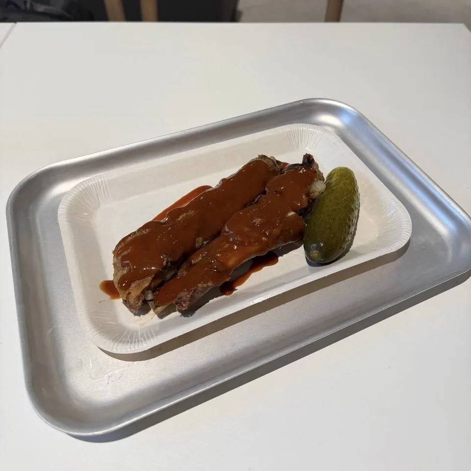 ▪️Свиные ребра (790₽) — ребра су-вид обжаривают и подают под соусом барбекю, с маринованным огурцом. Соус слишком кислый, а ребра суховаты, да и мяса там очень мало. Мимо.