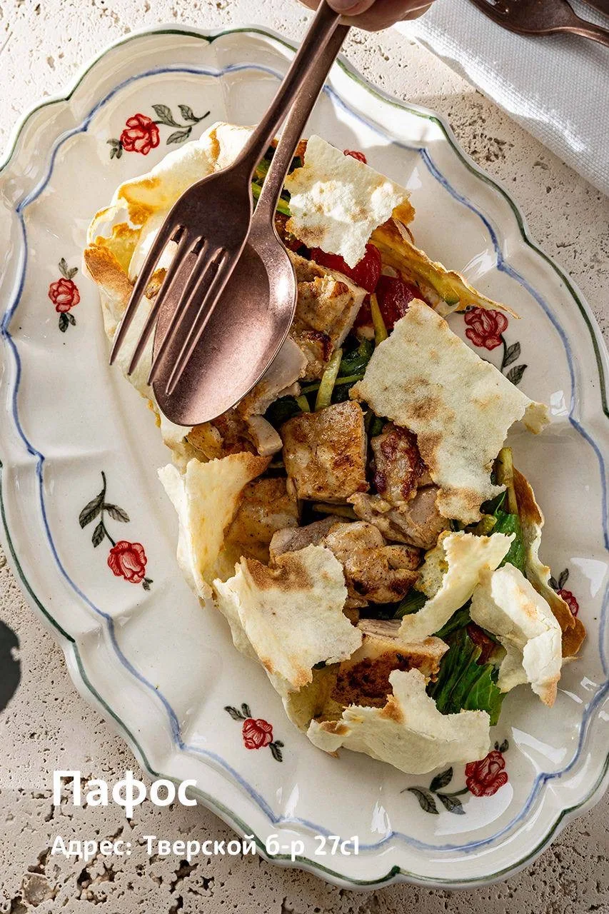 ▪️Пафос — гирос с ягненком (1300₽). Свежие овощи, соус дзадзыки, пряности, оливковое масло, при подаче накрывают аэробагетом и ломают лепешку.
