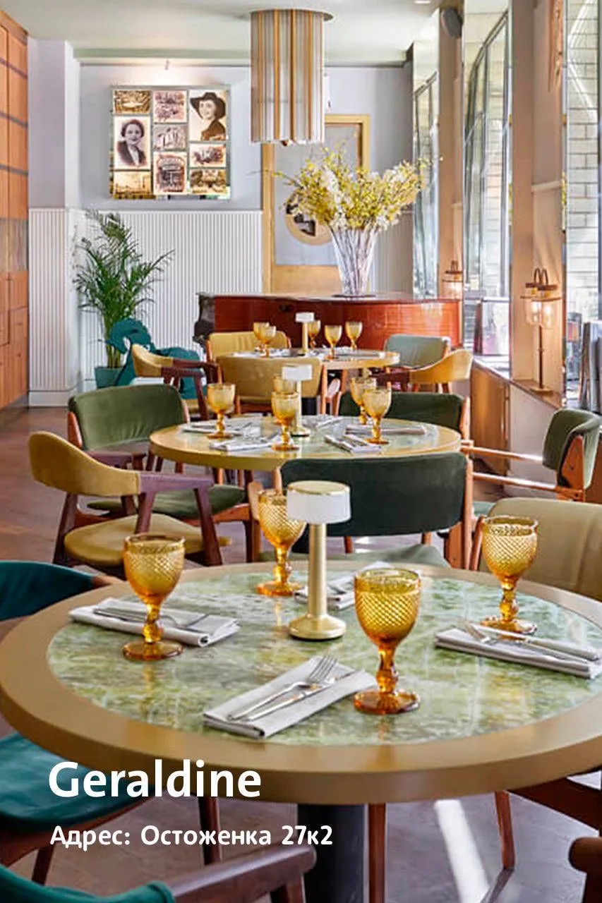 ▪️Geraldine — необистро от Александра Раппопорта и Владимира Познера. Во главе французская кухня и импровизации на другие кухни. Интерьер в оттенках золота, голубой лазури и зелени.