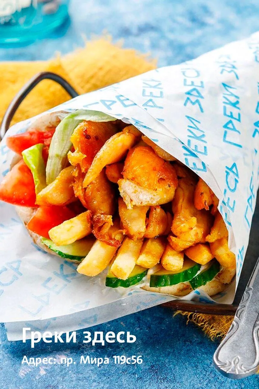▪️Greeks&Pasta — гирос с ягненком (760₽). Соус дзадзыки, красный лук, помидоры, перец рамиро, салат, петрушка, масло бер-нуазет, приправа заатар.