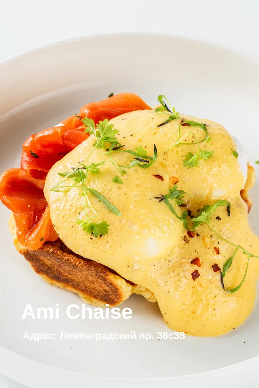 ▪️Ami Chaise — в меню скрембл с мортаделлой, зеленая гречка с грибами, бутер с красной икрой, сырники с вишней, бенедикт с лососем и др. Открыты с 8:00.