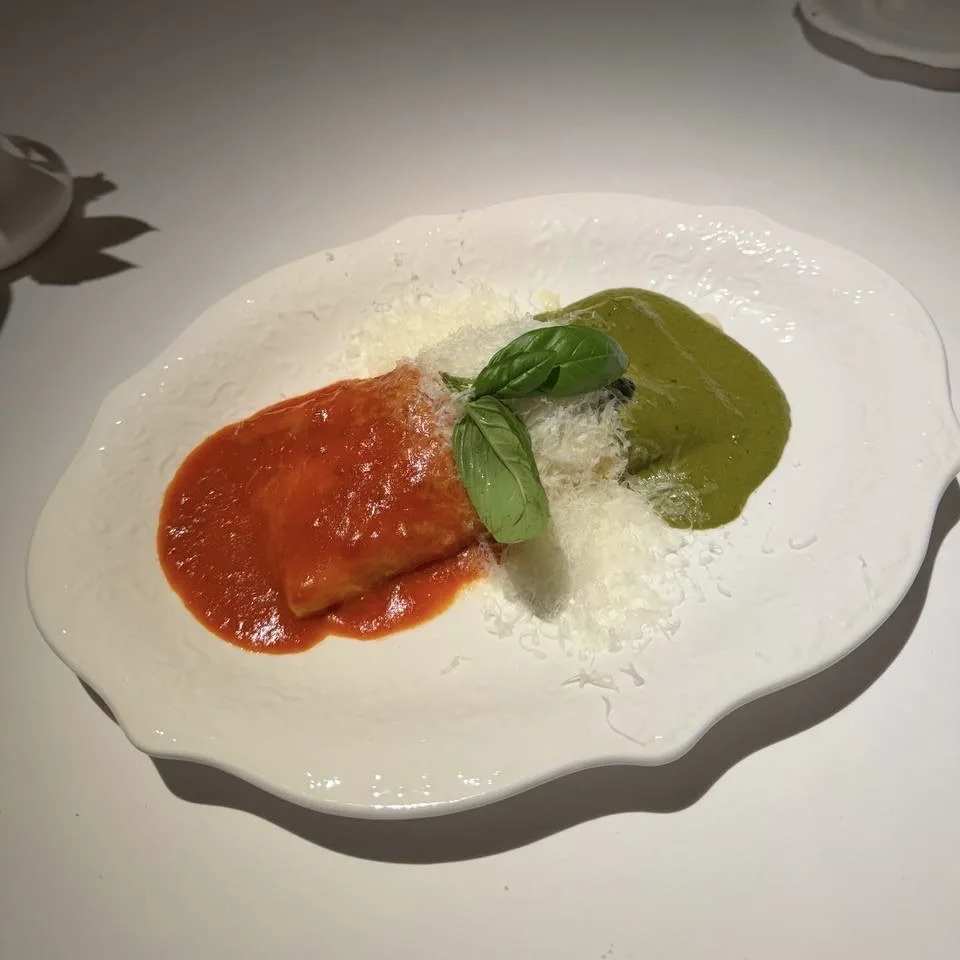 ▪️Лазанья (1390₽) — подаётся в форме итальянского флага, сверху слой из песто, томатной пасты и пармезана, в остальном классическая, идеально приготовленная лазанья, крайне рекомендую. В 22 году цена была 790₽ 🥲