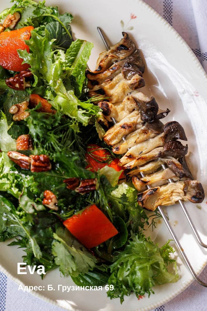 ▪️Eva — овощной суп (750₽), салат из цукини с фундуком и красным апельсином (710₽), зеленый салат с вешенками на шпажке (1150₽).