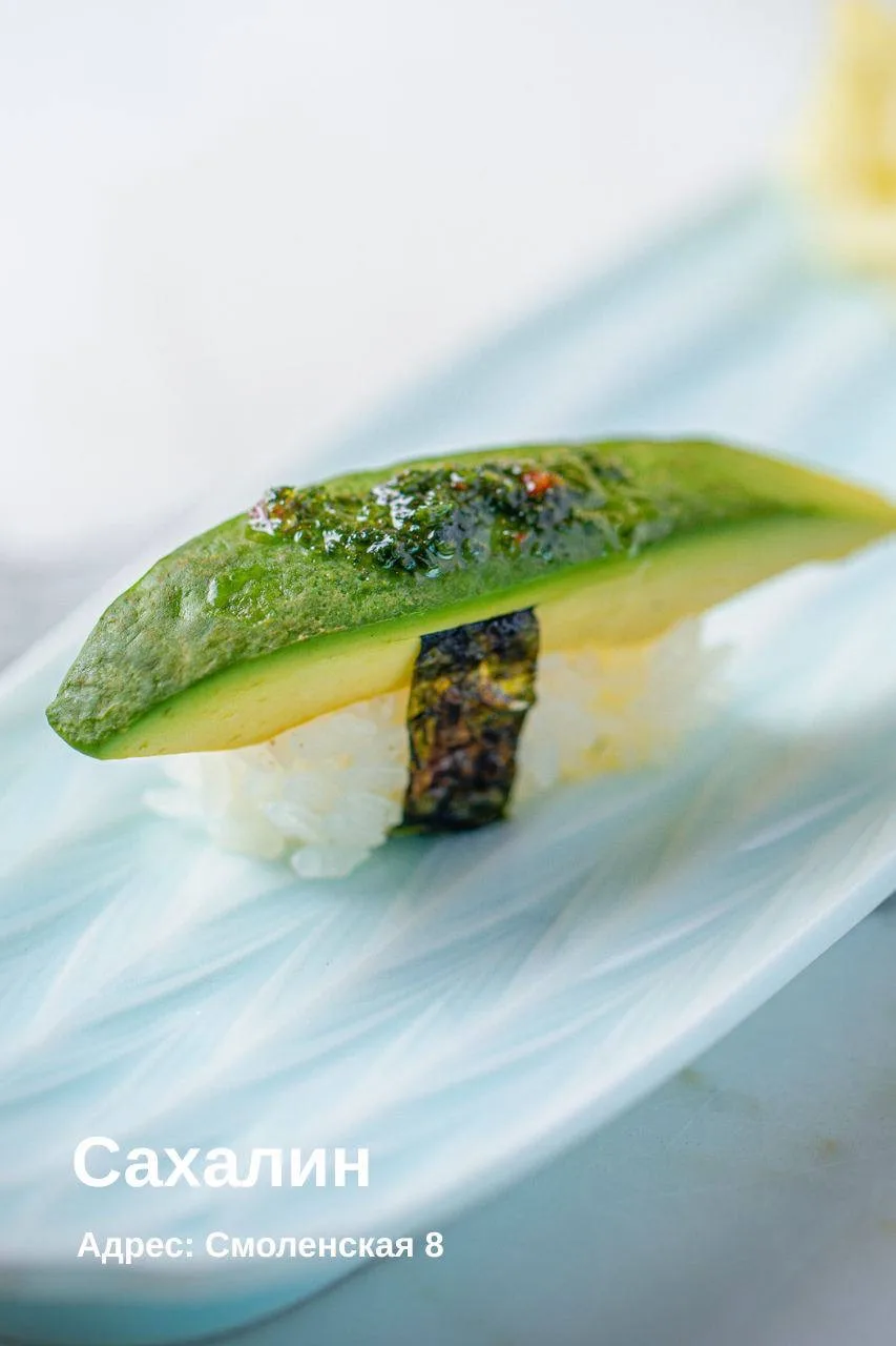▪️Сахалин — суши с авокадо и чимичурри (250₽), с печеной свеклой и васаби (250₽), карпаччо из корня сельдерея с трюфелем (1550₽), дим-сам с овощами (400₽), печеный баклажан (850₽).