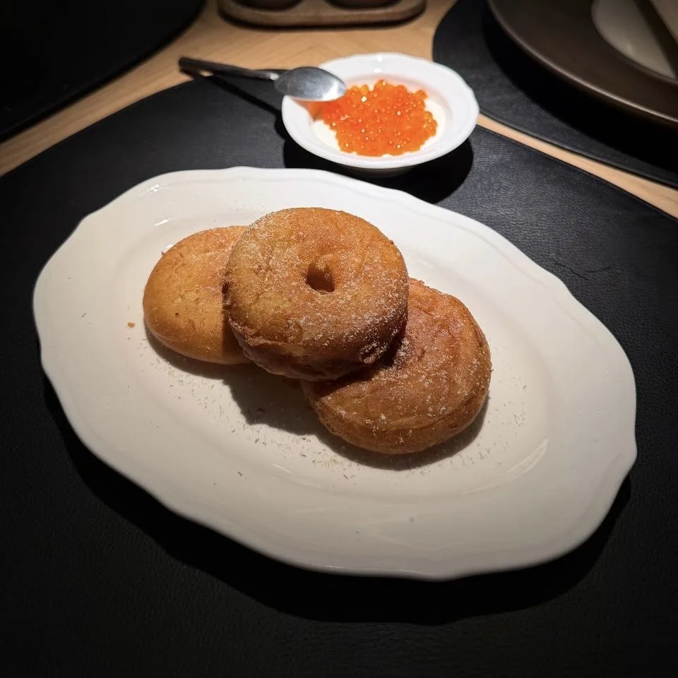 ▪️Картофельные пончики (1320₽) — начинка из картофеля и жареного лука, посыпают луковой пудрой, подают с соусом из сметаны, сливочного сыра и укропа, и красной икрой. Нереально вкусно, но блюдо довольно тяжелое, лучше брать на двоих.