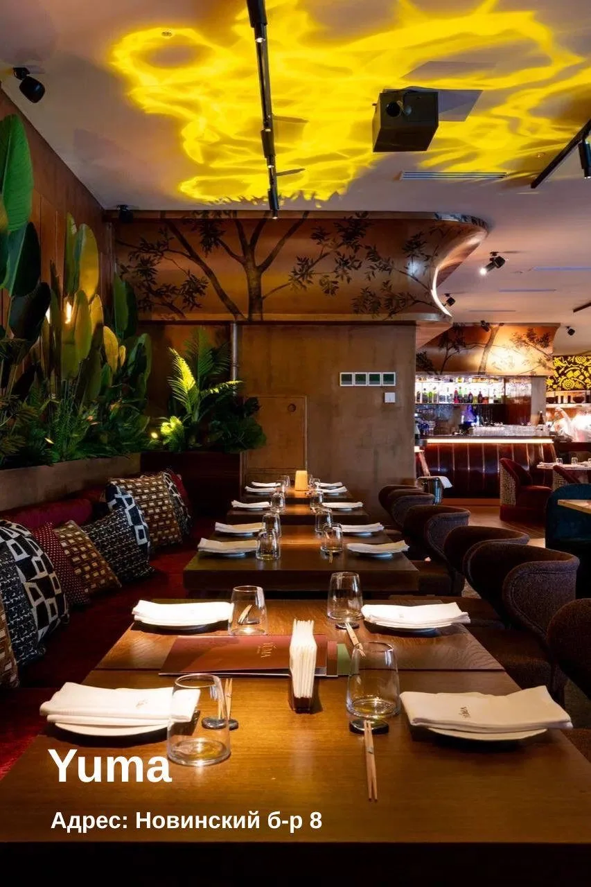 ▪️Yuma — азиатский ресторан Ильи Биниаминова (Levantine Family). В интерьере люстры-купола, контактый бар, открытая кухня и гриль, совмещающий японский робата и песчаный гриль.