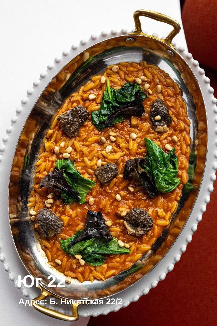 ▪️Юг 22 — хумус с печеными овощами (850₽), салат из свеклы с артишоком (850₽), орзо с белыми грибами и черными лисичками (1550₽).