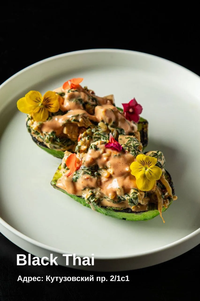 ▪️Black Thai — авокадо гриль со шпинатом и тофу (1050₽), томаты с соусом тайский песто (1150₽), крем-суп из батата с тофу (850₽), батат с грибной икрой и ореховым соусом (1300₽).