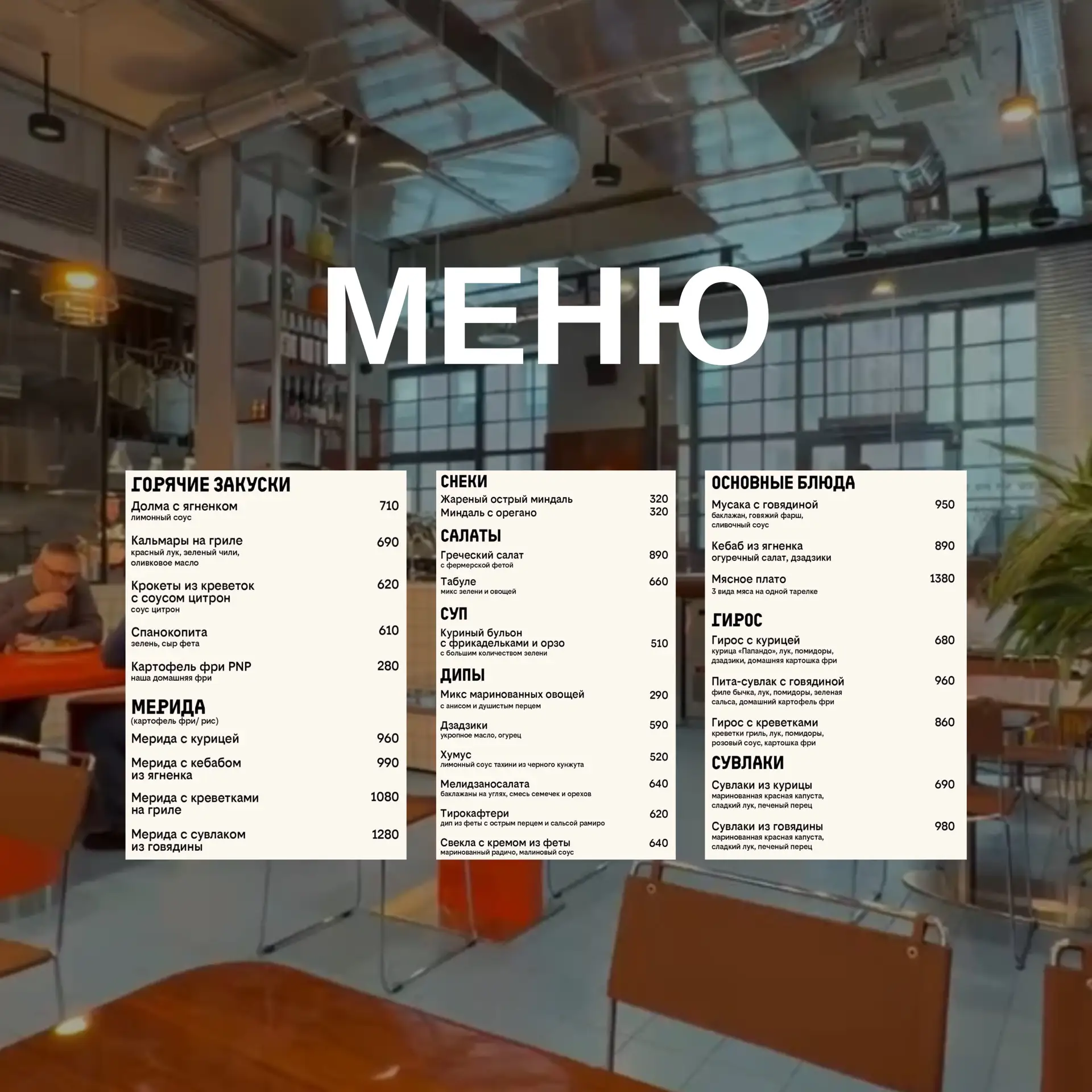 В основе меню греческий стритфуд от Давида Папазян (Klich). Бренд-шеф Костя Атмаджан (So Far Kebab, «Все твои друзья»). Яркий интерьер: синяя плитка, хромированные столешницы, большие окна, открытая кухня.