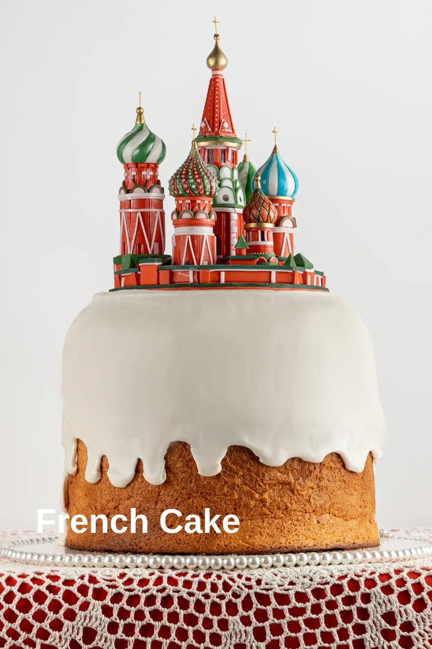 ▪️French Cake — Кремлёвский кулич (100.000₽). Классический кулич с ванилью и цедрой апельсина, с изображением храма Василия Блаженного из мастики ручной работы.