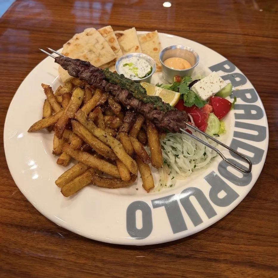 ▪️Мерида (1280₽) — сувлаки из говяжьей вырезки, зеленая сальса, лимон, картофель фри, маринованный лук и что-то типа греческого салата, но с лимонной заправкой, пита, дзадзики и соус 1000 островов. Гарнир на выбор: рис или фри. Если ты не ел сутки, иначе осилить это в одно лицо будет непросто.