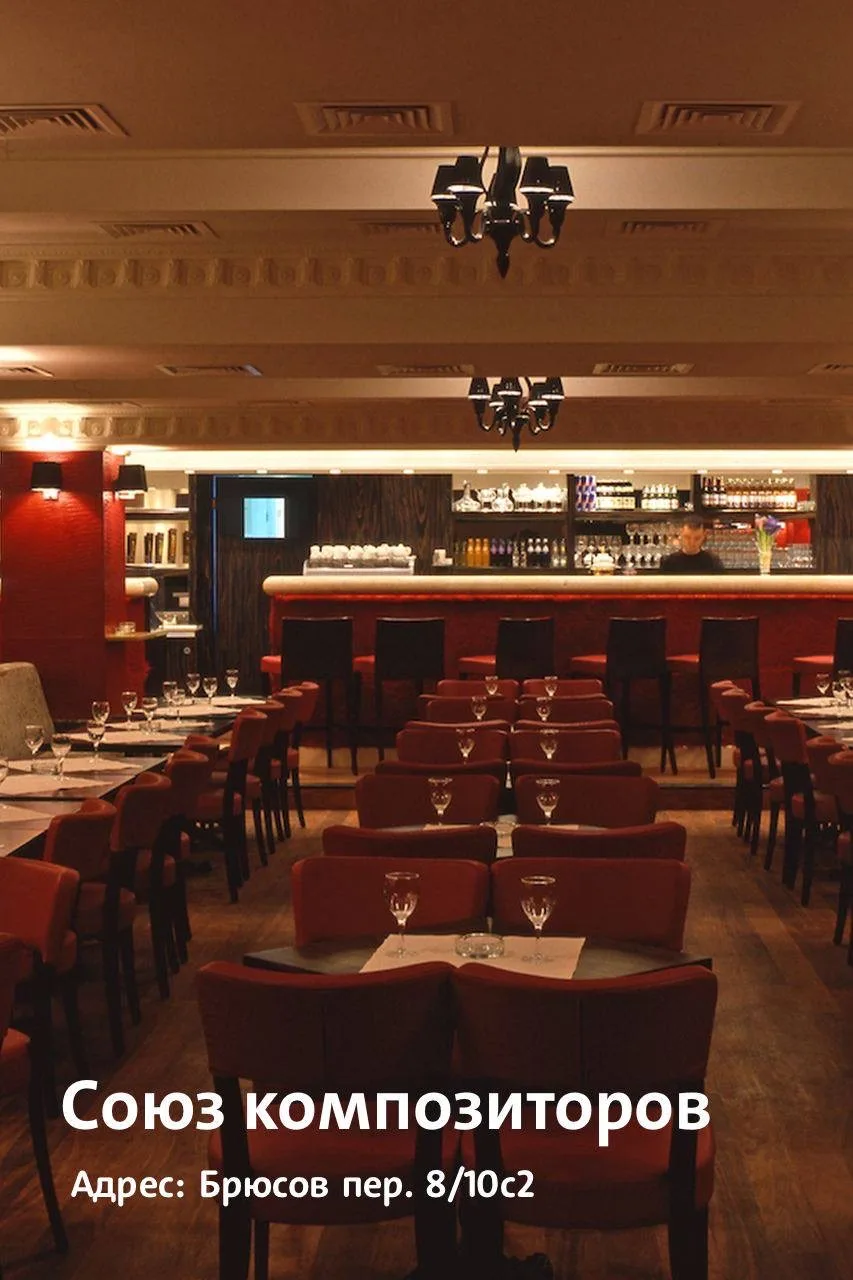 ▪️Союз композиторов — джаз-клуб со звёздами русского джаза, рока и блюза и мировыми звёздами. В меню европейская кухня. Интерьер оформлен в красных оттенках.