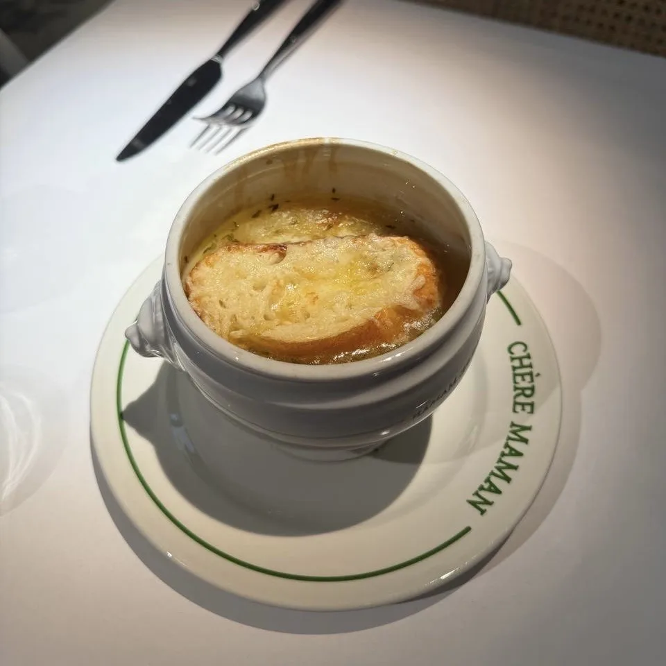 ▪️Луковый суп (480₽) — репчатый лук, чеснок, белое вино, куриный бульон, сыр грюйер, багет. Абсолютно ровный, вкусно, но без вау.