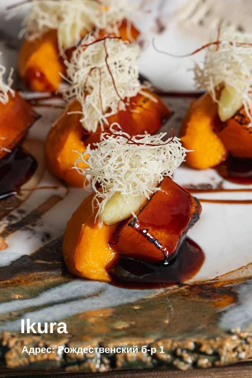 ▪️Ikura — роллы с острым тофу с салатом из авокадо (1090₽), баклажан мисо с пикантной и постной юдзу сметаной (590₽), батат с тыквенным пюре и хворостом из картофеля кидзаме (630₽).