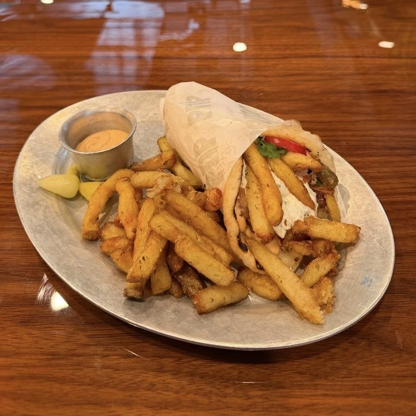 ▪️Гирос с курицей (680₽) — лепешка, замешанная на айране, курица «Папандо», красный лук, томаты, дзадзики, картофель фри, маринованные перцы, соус а ля 1000 островов. Картофель готовят в 3 этапа: варят, обжаривают на низких температурах, потом на высоких, затем обваливают в орегано. Получается что-то между фри и по-деревенски. Шикарно!