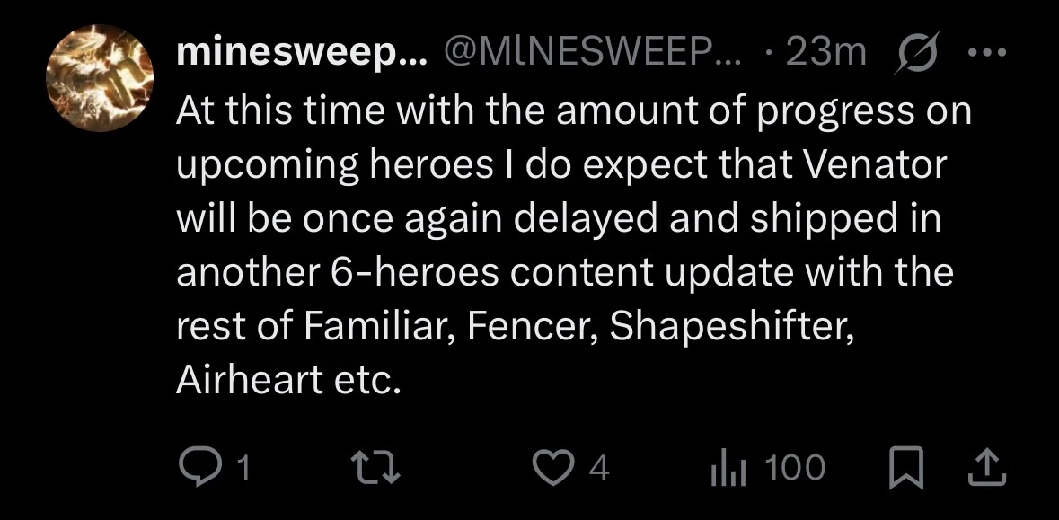 «На данный момент, учитывая объем работы над новыми героями, я ожидаю, что Венатор снова будет отложен и будет выпущен в составе другого обновления контента из 6 героев вместе с остальными Фамилиаром, Фехтовальщиком, Оборотнем, Воздушным Сердцем и т. д.»