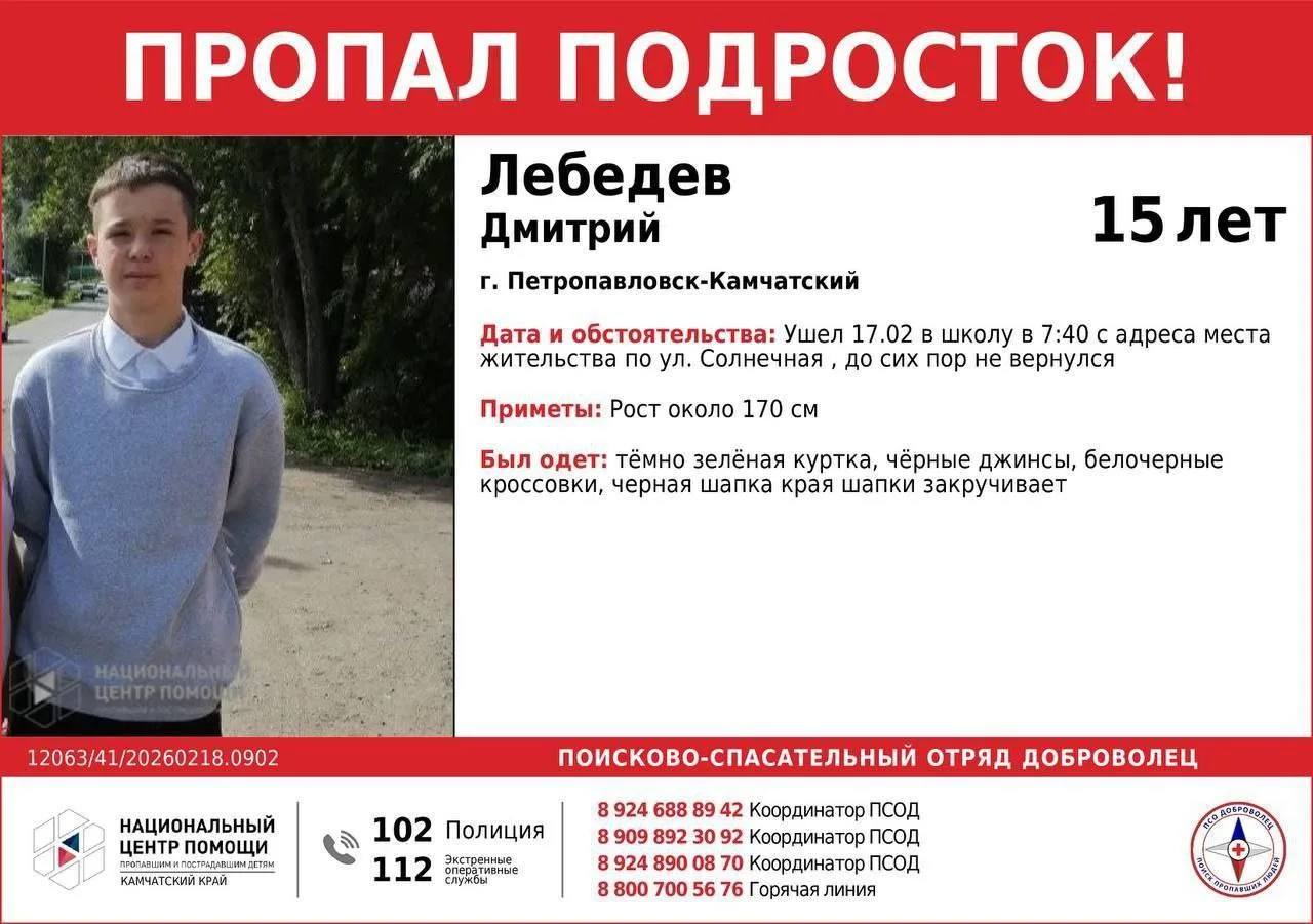 17 февраля из дома по улице Солнечная в Петропавловске-Камчатском пропал 15-летний Дмитрий Лебедев. Он ушёл в школу, но до сих пор не вернулся.