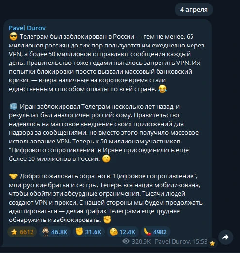 Основатель Telegram Павел Дуров официально поддержал российских пользователей в борьбе с блокировками мессенджера. По его словам, попытки властей ограничить доступ к сервису лишь спровоцировали массовый интерес к обходу запретов и вызвали технические сбои в масштабах всей страны.
