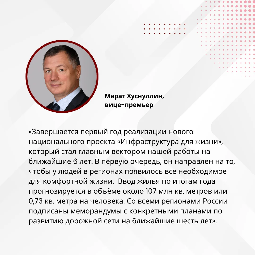 Заместитель Председателя Правительства РФ Марат Хуснуллин провёл заседание президиума Правительственной комиссии по региональному развитию, где подвели итоги работы в 2025 году в рамках национального проекта «Инфраструктура для жизни».