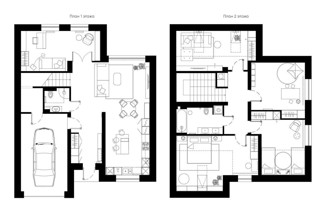 Часть первого этажа занимает гараж, поэтому жилая площадь компактная.
