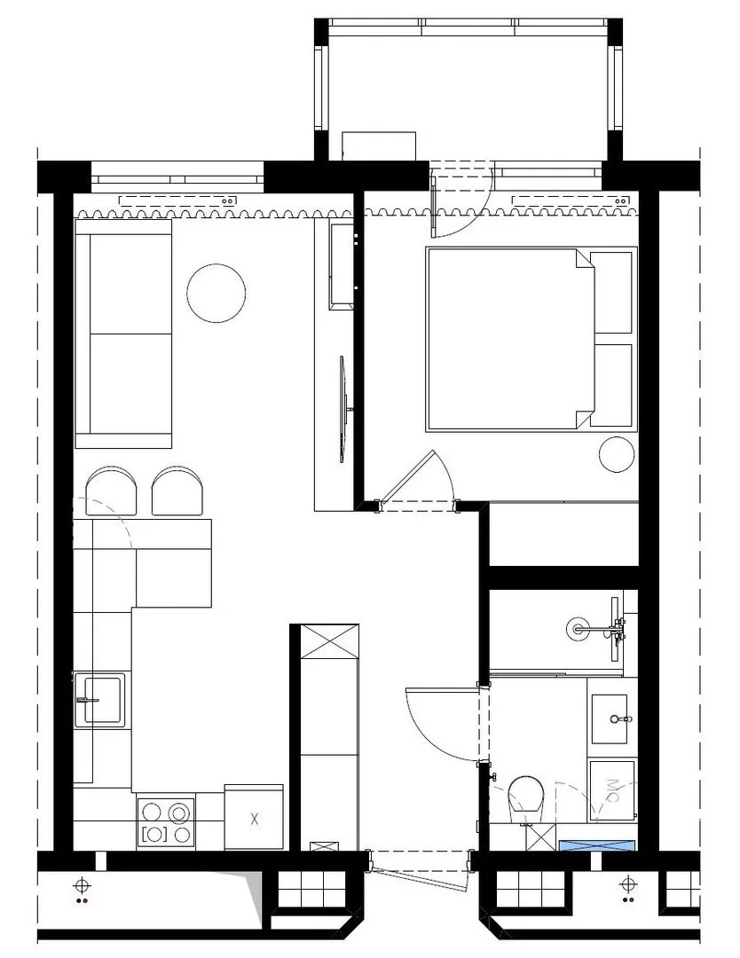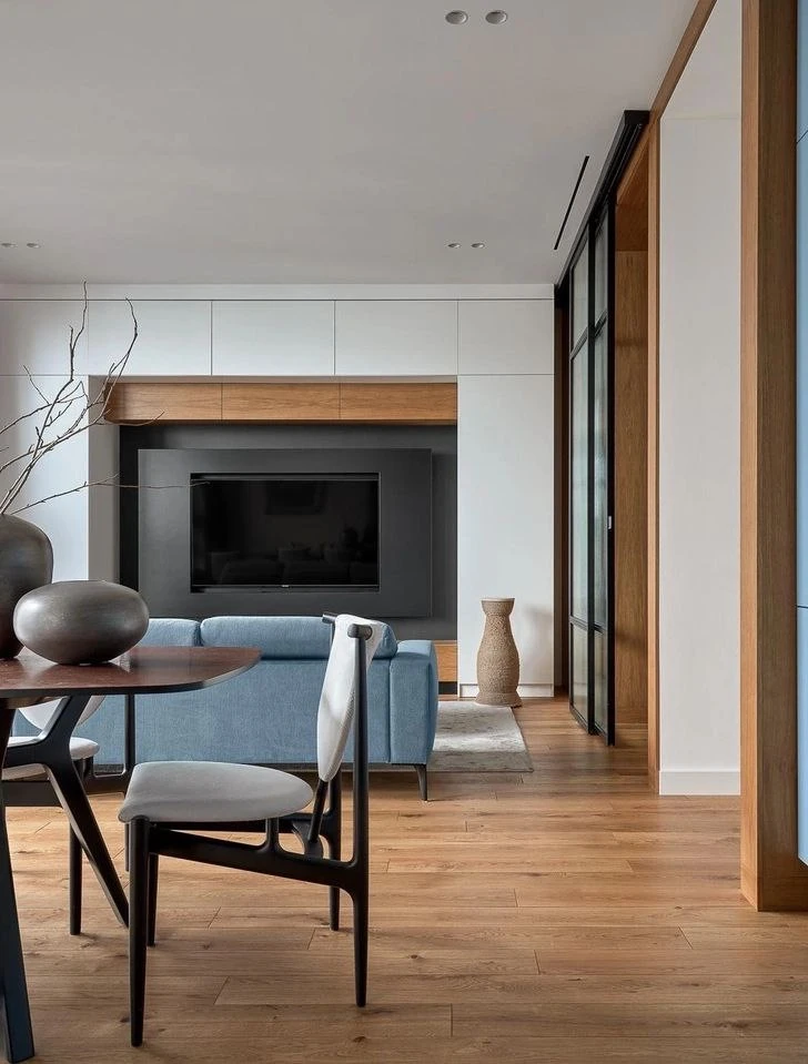 Эта студия первая общая квартира для заказчиков. Хотели создать максимально комфортное пространство и обратились к дизайнеру Ольге Слугине. Фактически формат квартиры — open space, где зонирование осуществляется с помощью прозрачных перегородок.