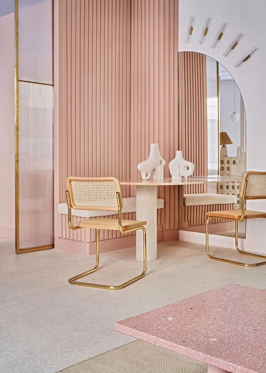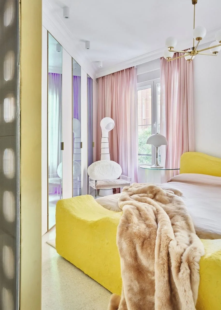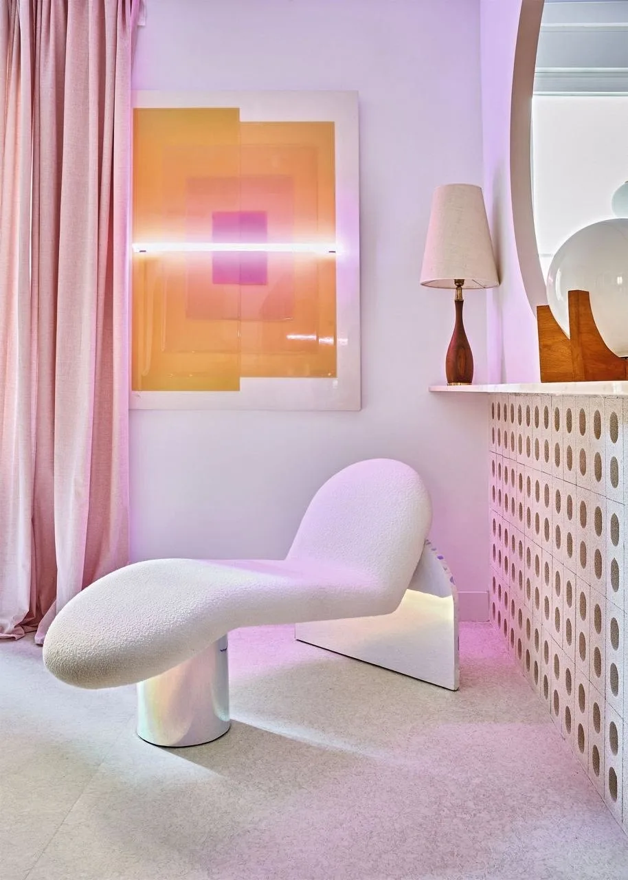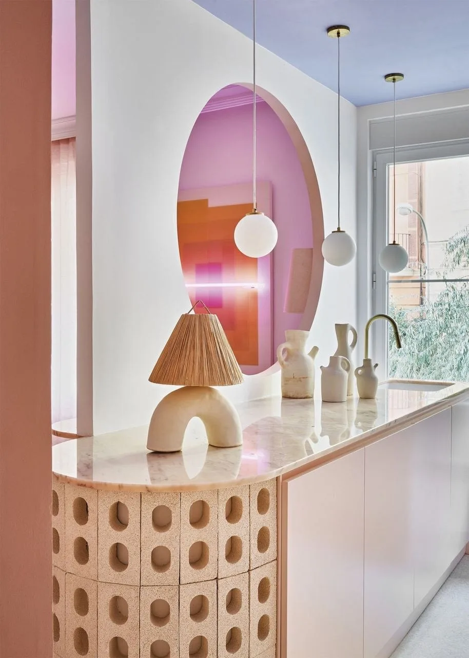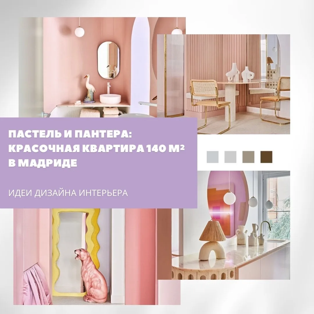 Эта мадридская квартира площадью 140 м² получилась словно арт-объект. Дизайнер Патрисия Бустос объединила в интерьере пастельные оттенки с неожиданными деталями: арочные проемы, розовая кухня с голубым потолком и скульптура яркой пантеры задают эксцентричный тон всему пространству.