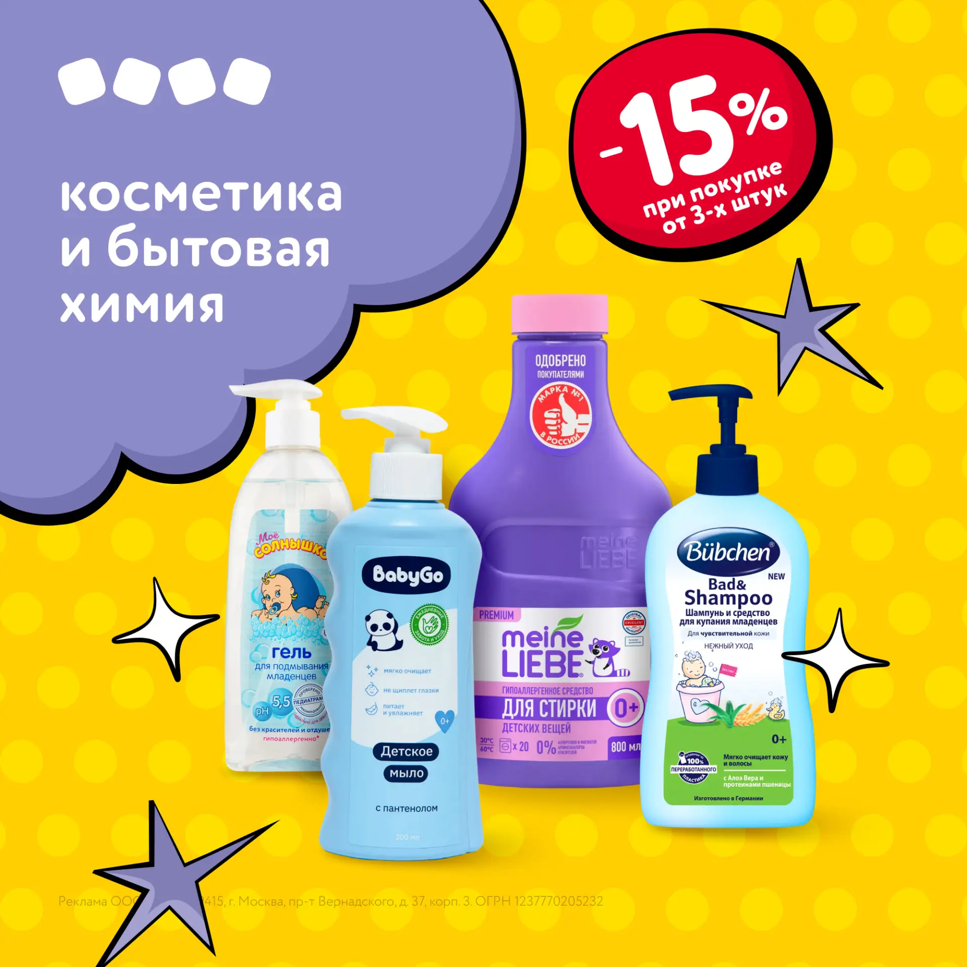 ➡ Дополнительная скидка 15% при покупке 3 и более товаров из ассортимента косметики и бытовой химии