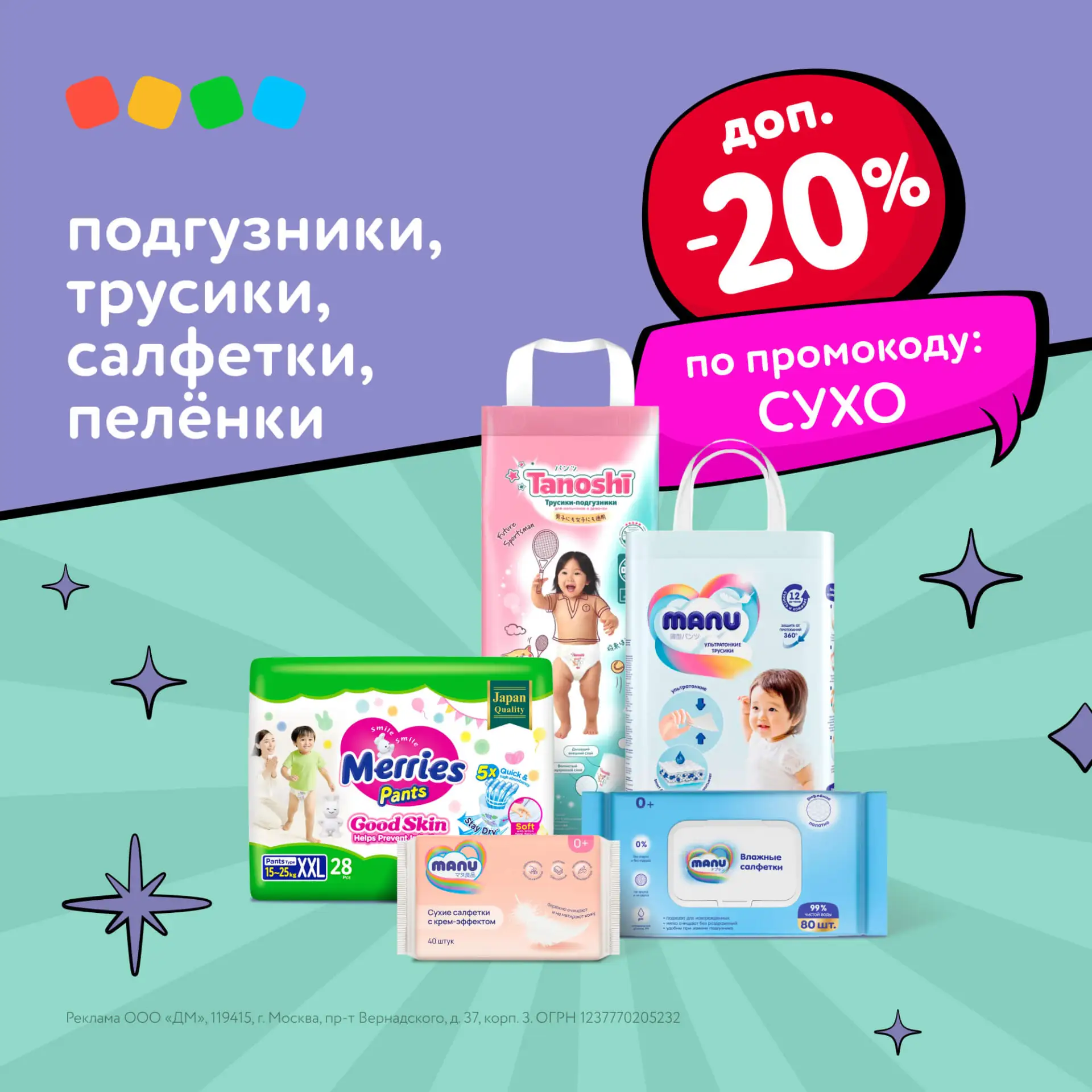 🍼 Дополнительная скидка 20% по промокоду Сухо на подгузники, трусики, салфетки и пелёнки