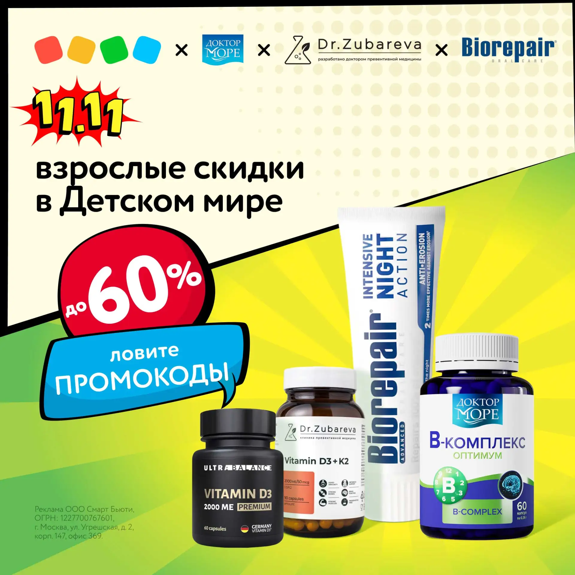 У нас тут взрослые скидки в Детском мире! Сотни товаров для дома, витамины, бакалея, косметика и многое другое, что порадует маму и папу 🛒