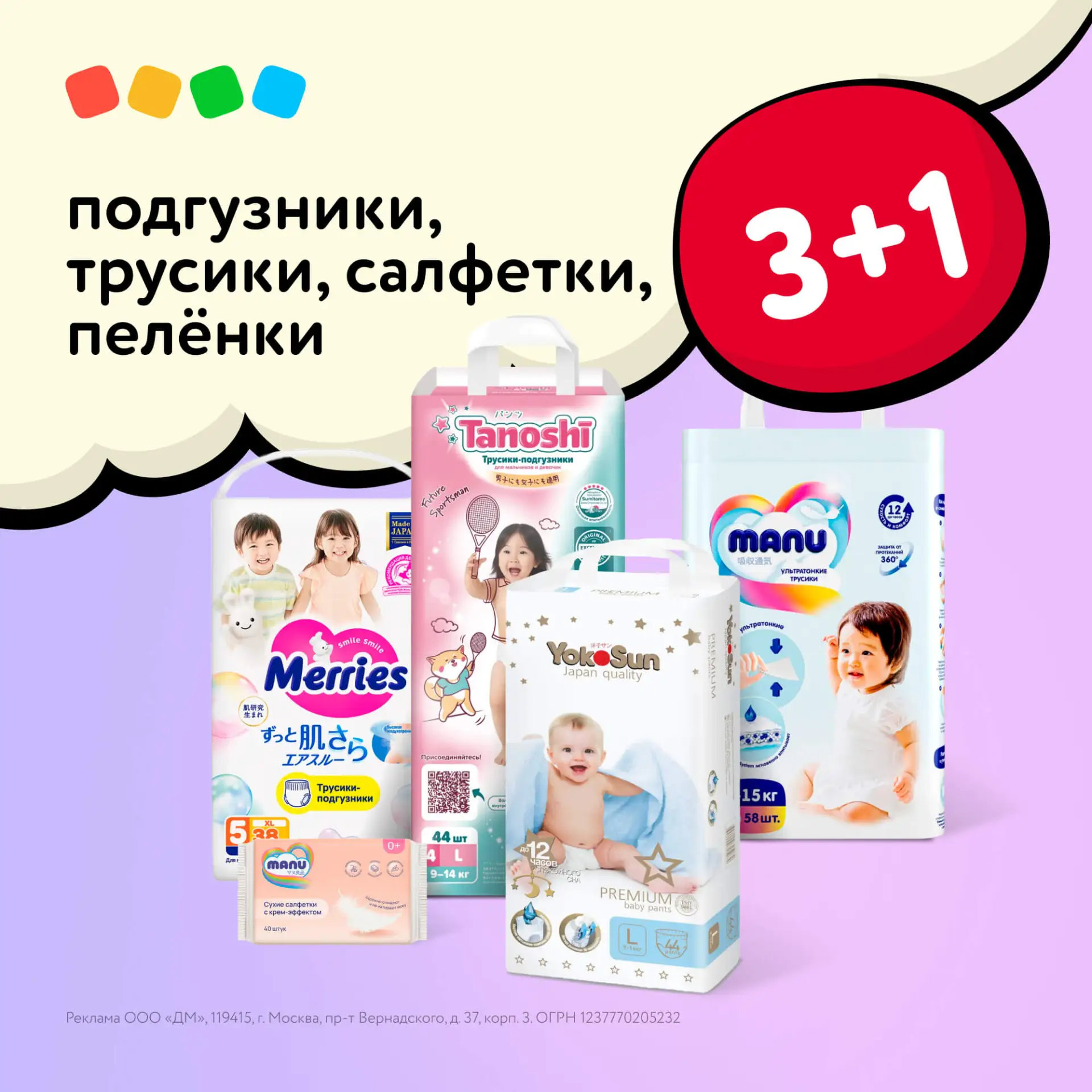 👉 Акция 3+1 на подгузники, трусики, салфетки и пелёнки