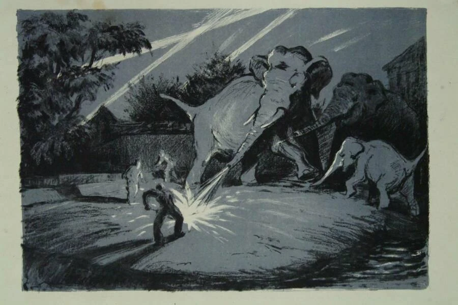 🐘 Это слон Шанго, который помог потушить зажигательную бомбу, упавшую на Московский зоопарк во время бомбёжки. Момент был запечатлён в картине В.В. Трофимова.