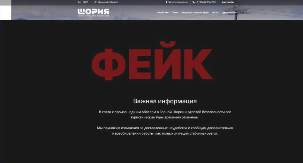 Друзья, мы столкнулись с неприятным инцидентом: сайт туристической компании "Шория" был взломан! Злоумышленники разместили ложную информацию о якобы крупных провалах земли на курорте и его закрытии.