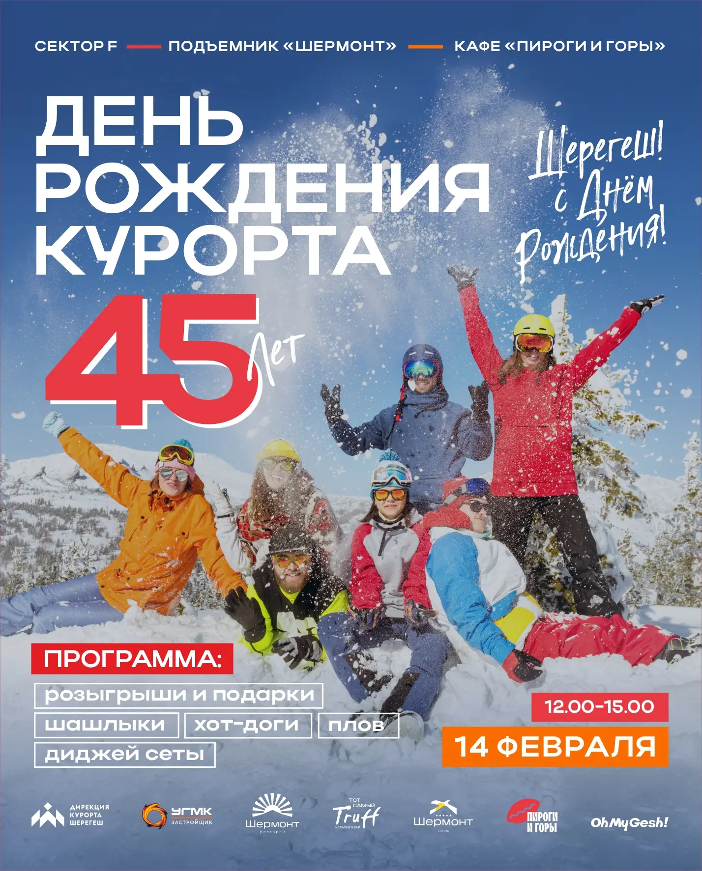 1. В феврале курорт Шерегеш отметил свой 45-й день рождения серией разнообразных мероприятий и активностей, такие как промо-фотоконкурс, увлекательная игра "Прятки" с ценными сертификатами, кроме того, были организованы нетворкинг-мероприятие для обмена опытом и коллабораций, мастер-класс по мозаике и тематические события в заведениях курорта, инициатором и координатором которых выступила дирекция Шерегеша, обеспечив широкое освещение в сети и распространение информации. Прошло масштабное празднование на секторе F, организованное совместно с ГК "Шермонт", кафе "Пироги и горы" и канатной дорогой "Шермонт", включавшее угощения, диджей-сеты и розыгрыш призов